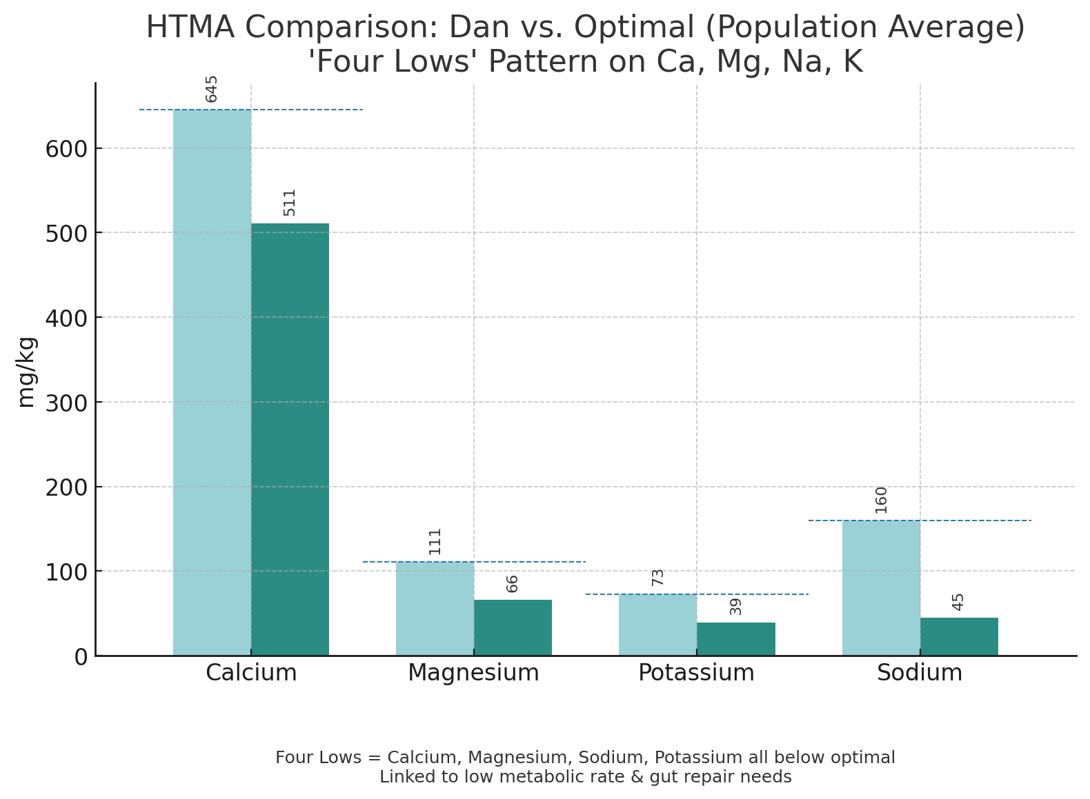 The results came back showing a Four Lows pattern = low calcium, magnesium, sodium, and potassium, meaning his body was in a state of metabolic “shutdown” from prolonged stress.